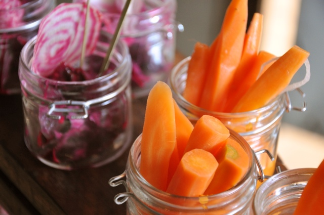 Vegetable platters get tired quickly. It’s great to have a selection of crunchy, fresh crudites on hand to help balance out the carbs and heavy foods you often find on holiday menus. There’s no rule that says you have to arrange them in rows or circles on a platter. Instead, take your cue from the W and pile them into jars or glasses for a completely different look.