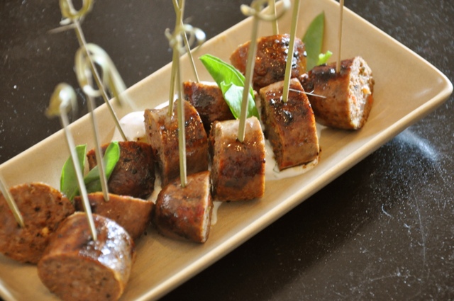 And while the folks at Trace make their own sausage, you can find high-quality fresh sausages from artisans in most places these days. In Austin I look no further than Dai Due or in the butcher’s cases at Whole Foods or Central Market. Sauces like tzatziki come together quickly you can pair just about any quality sausage with a sauce in this presentation for appetizers in a flash.