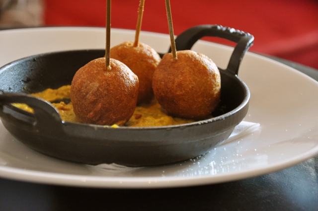 The culinary team at the W used mini Staub cast iron skillets for several different presentations, including a whimsical twist on state fair food with corn dog balls resting right in bright yellow mustard for a nice color contrast.