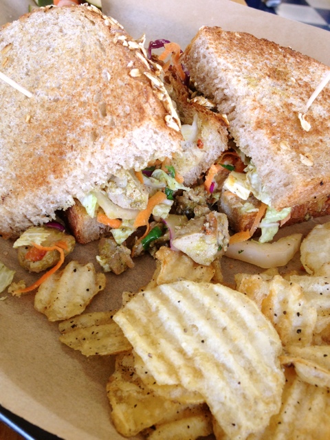 The Thai Chicken isn’t your mom’s chicken salad. Big chunks of tender chicken are tossed with Asian spices and topped with a crunchy jalapeno cabbage slaw.