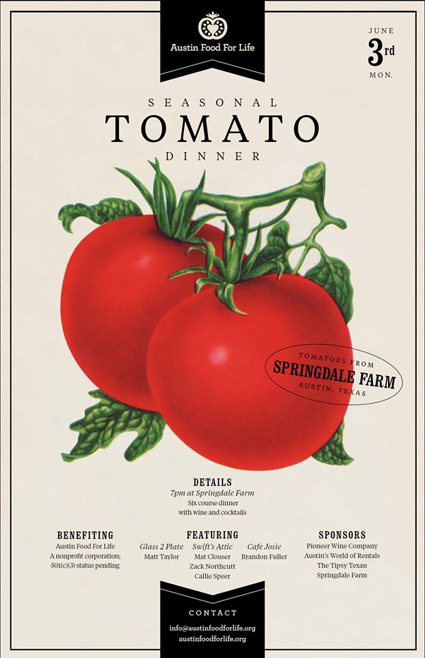 Austin Food for Life is committed to bringing affordable healthcare options to the Austin food community. You can give the a helping hand and enjoy the best of summer’s tomato crop at a six course dinner devoted to and inspired by tomatoes. Chefs from Swift’s Attic, Glass-2-Plate, and Cafe Josie will take tomatoes to places you can’t imagine and just won’t expect. Tomato-inspired cocktails and wine pairings for each course will round out the evening on the beautiful grounds of Springdale Farm.