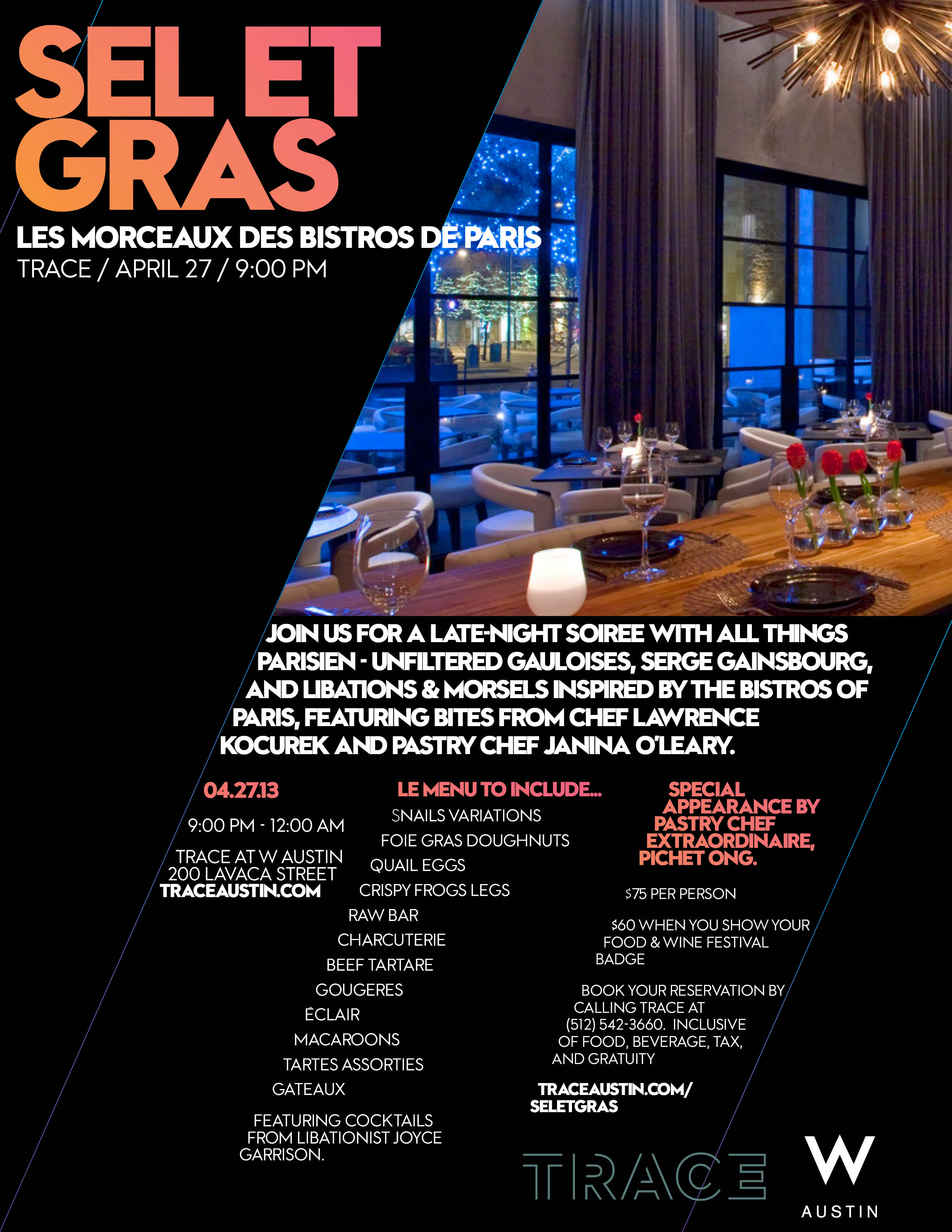 TRACE at the W Hotel brings the sights, sounds and tastes of France to downtown Austin with this special culinary event, Sel et Gras. Following the Austin FOOD & WINE Festival’s popular Rock Your Taco competition, head over to TRACE to continue your evening with an array of flavorful sweet and savory bites as well as classic French wines and cocktails. TRACE’s main dining room and lush outdoor patio will be transformed, creating a Paris Bistro ambiance with a DJ spinning classic French pop music a la Serge Gainsbourg and Brigitte Bardot. Classic French wines will flow and inspired cocktails from W Austin’s head libationist, Joyce Garrison, will be poured.